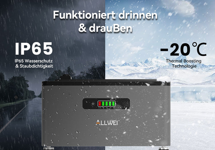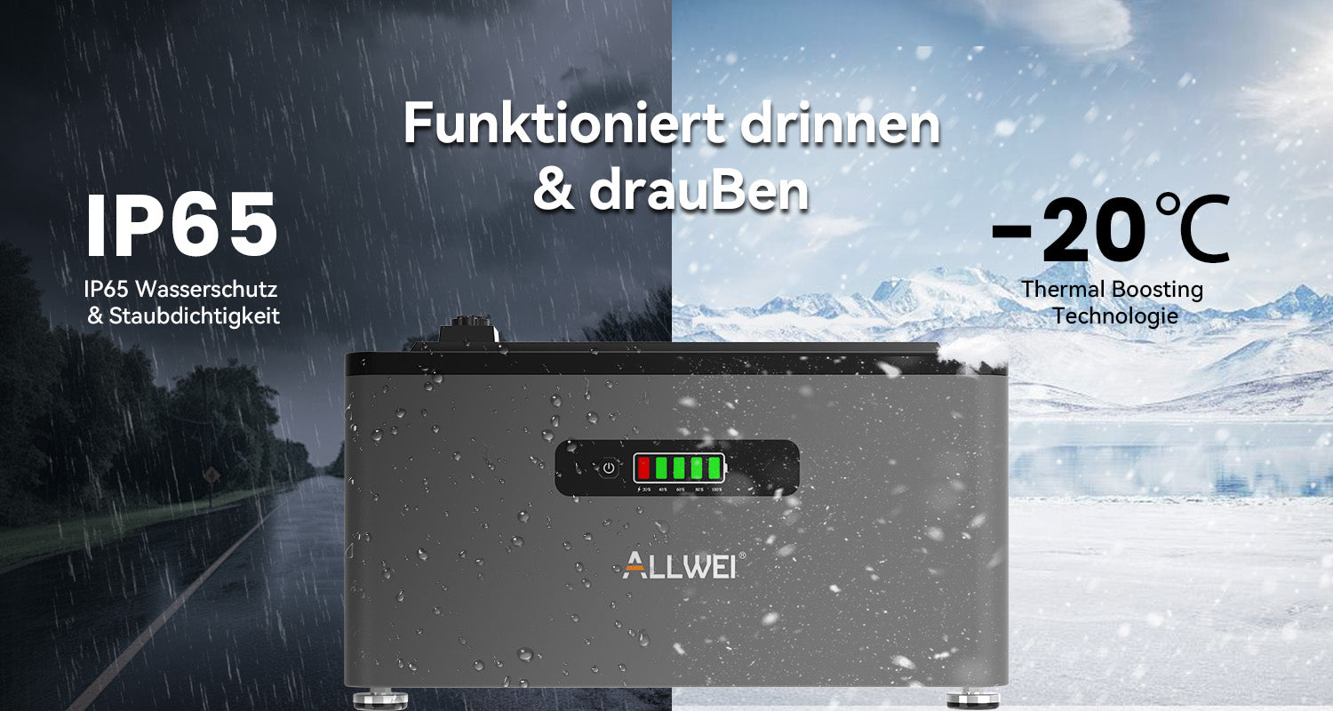 Wetterfester Schutz: Diese Erweiterungsbatterie ist für Temperaturen von -20°C bis 55°C geeignet. Sie verfügt außerdem über eine IP65-Dichtung zum Schutz vor Wasser und Staub.